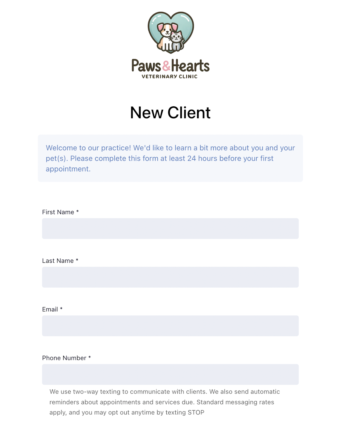 Attach forms to your appointment confirmation templates to collect information from clients before their appointments. There are two forms currently available: