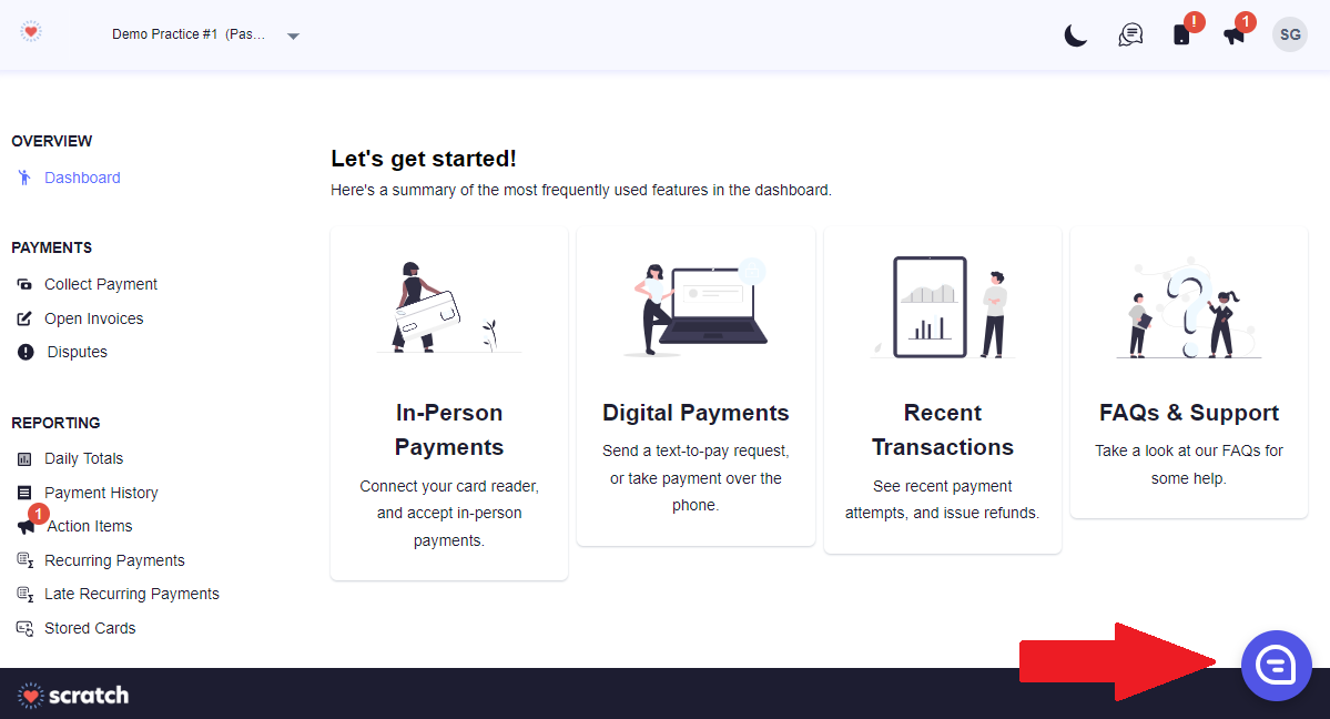 Chat: click the purple chat icon at the bottom right of your dashboard