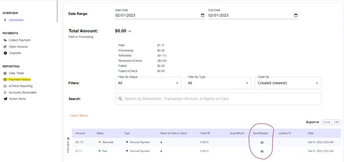 From the Payment History tab on your dashboard, find the payment for which you'd like to send a receipt and click on the envelope icon in the column labeled Send Receipt.