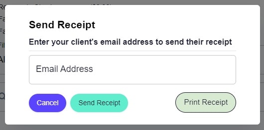 This will open a popup where you will either enter the email address to which you would like receipt sent and click Send Receipt, or click Print Receipt to generate a PDF that you can then print.