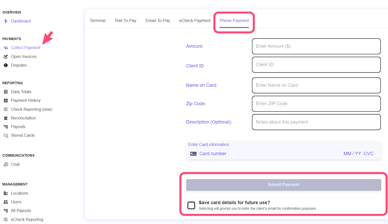 From the left navigation menu, under Payments select Collect Payment, then go to the Phone Payment tab.