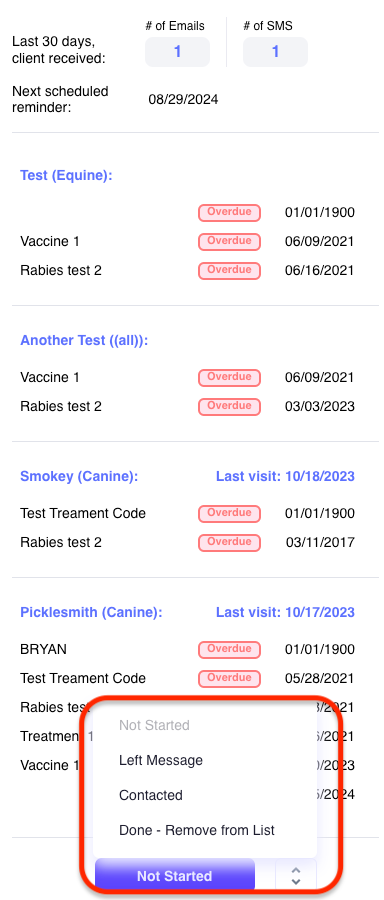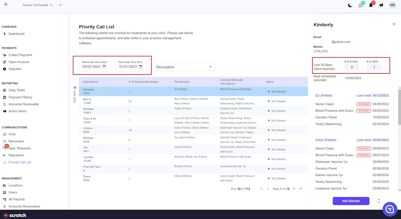 Use the Priority Call List to reach out to clients with overdue treatments. The date range allows you to prioritize those most likely to schedule an appointment. We list the email and SMS reminders sent to that client in the last 30 days, along with the overdue and upcoming treatments for each pet.