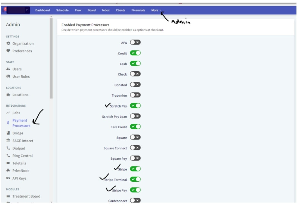 Go to the Admin option up top, then select "Payment Processors" under Integrations, and then select the 4 options and toggle them on for the ones in the screenshot provided.